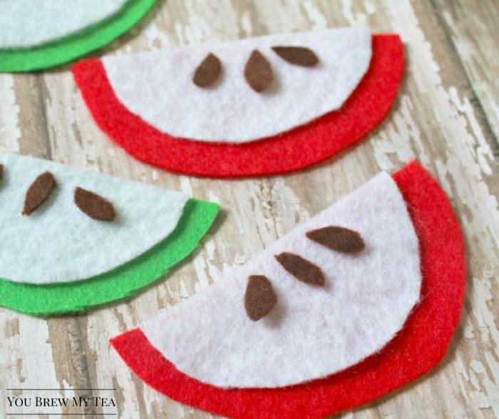 5. Snip out small brown ovals from the brown felt. These are the apple seeds. Add some glue and press them to the apple halves.