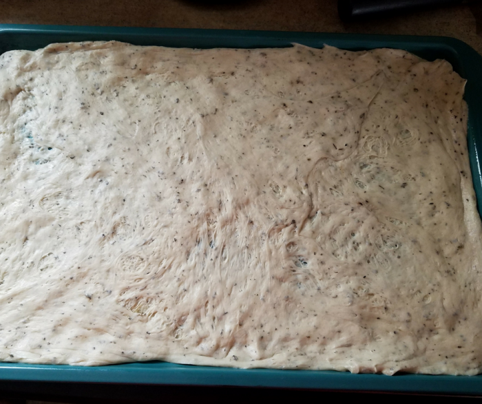 Spread dough over pizza pan or baking sheet. We used a traditional 11"x17" baking sheet. It will take work to pat down and spread dough to fit into the pan, and the dough will be thin.