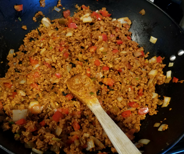 - In a large skillet or large wok, heat olive oil, bell pepper, onion, garlic, salsa, and meatless crumbles.